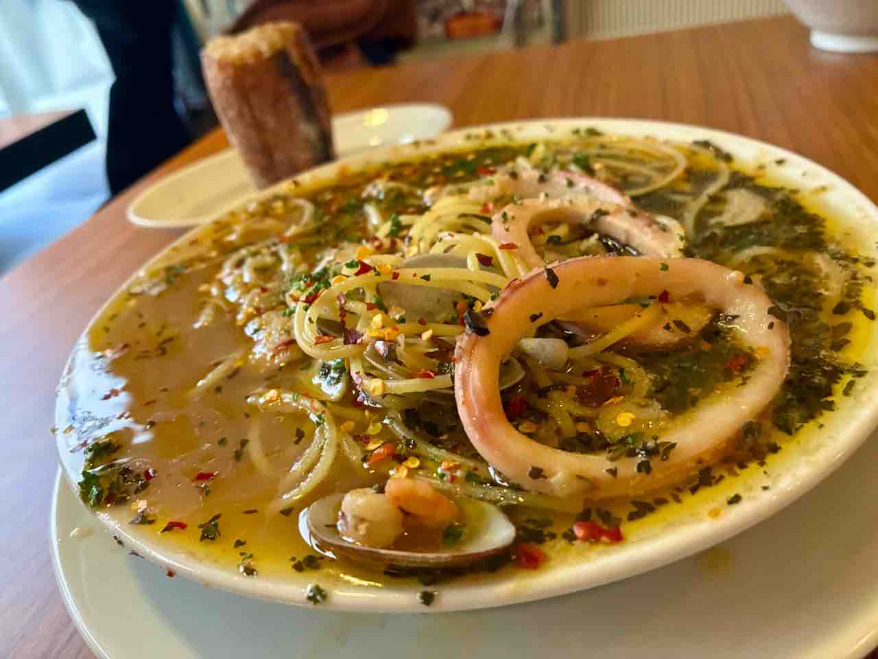今日のランチは、 シモキタ洋麺店で、海の幸シーフード ペペロンチーノの麺90g、ミニサラダ、ガーリックトースト。麺少なめがあって助かった!メニューが豊富で悩みましたがお初なので王道そうなこちらにしてみました。ペペロンだからガーリックすごいかと思いきや思っていたほどではなくてガーリックトーストとかぶらずよかった。記帳制になっていたのも有難い。この量なら色々試せそうでうれしい🤤