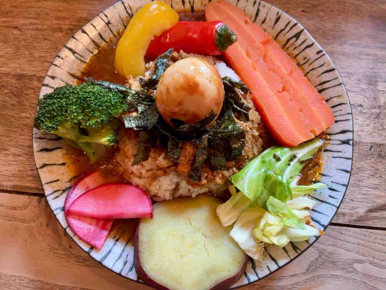 今日のランチは、 狛犬hug meで、山椒豚キーマとチキンスープカレーと、蒸し野菜に、本日限定トッピングのスパイスどて味噌蒸し玉子。なかなかタイミングが合わなかったがようやく来られた。スープカレーの味が好み😍新鮮野菜もたくさん食べられて満足。店主さん面白すぎ🤣