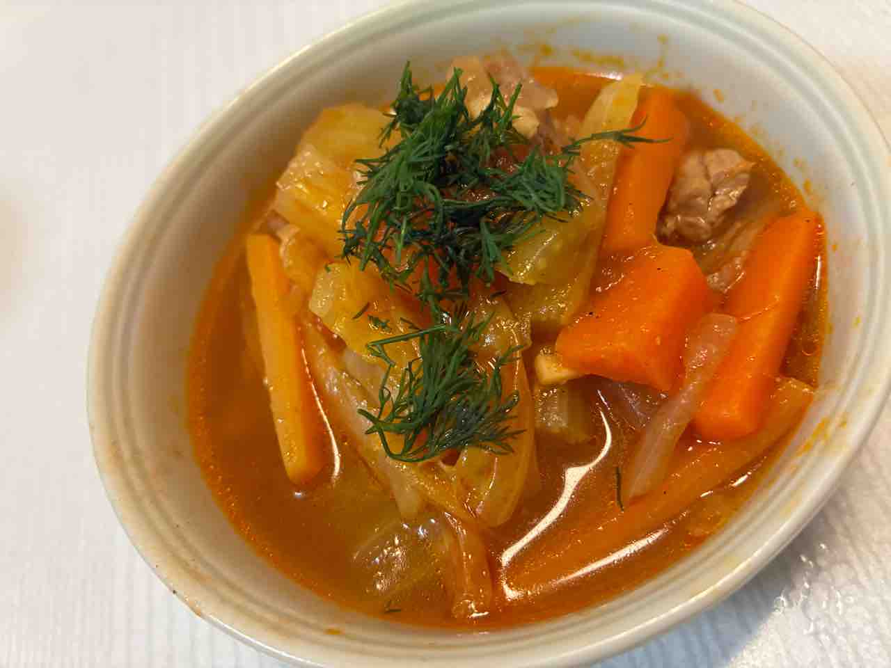 稲田さんの新刊からボルシチ作ってみた。野菜はマストの玉ねぎ、キャベツ以外は自由だったので人参と余っていたセロリをかなり投入。煮込み時間30分〜は60分。冷凍してあったディルを添えて。めちゃくちゃ美味しい😋💕