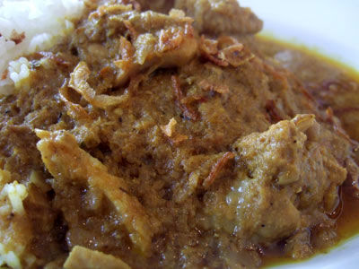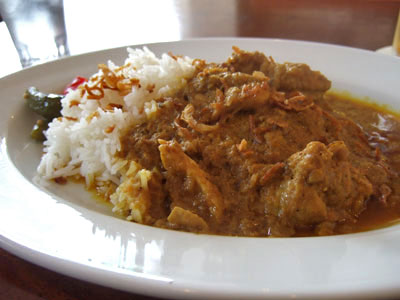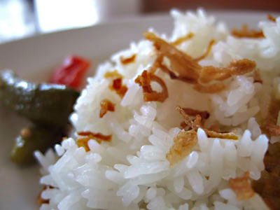 タイ米の上にはフライドオニオンがぱらり。ちなみにこちらのカレーにはタイ米、日本米どちらでも合うと思います。