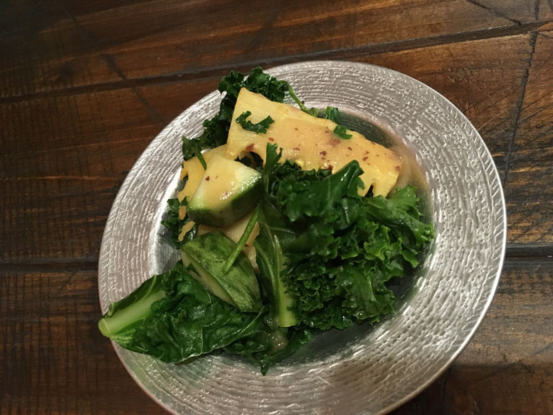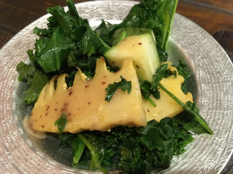 カリーノケール・クレソン・小メロン・筍をデーツ(ナツメヤシ)で和えたサラダ
