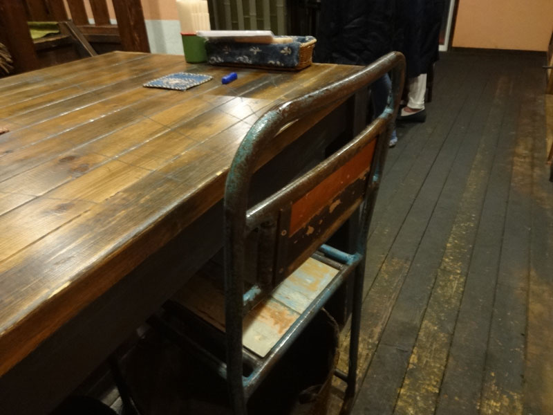 4人掛けのテーブル席のイス。どこか学校を思わせる風貌で味があります。のちに両隣におひとりさまの男性客が座られ、ちょっと面白い空気でした。