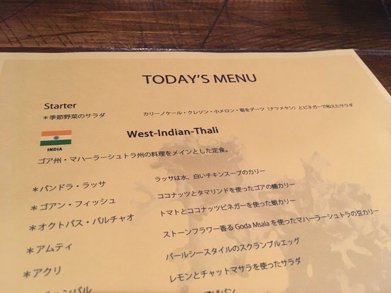 この週は西インド料理。西インド!初めてかも[E:flair] 当日のメニューが各テーブルに置かれていました。期待で胸がふくらみます[E:heart01]