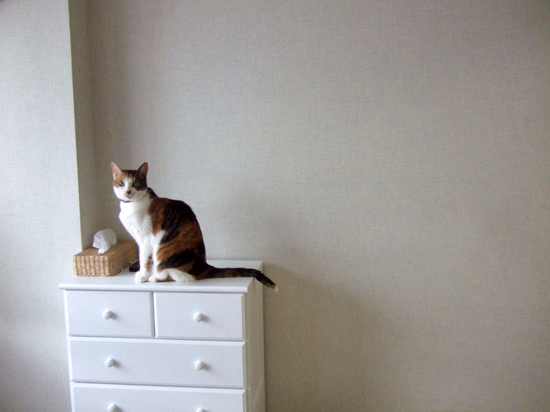 「これは何かしら?」 引っ越し先に白いチェストを買ってみたら、さっそくハナてぃんが。