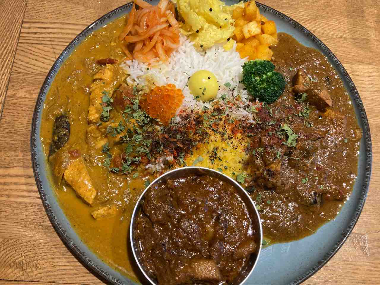 今日のランチは、SpiceCurry FIFTYで、カルダモンチキンカレー、ポークビンダルー、サーモンといくらカレーのあいがけ。サーモンといくらがユニークでよかった。どれもおいしかったけど何かいまひとつパンチが足りない感じがした。