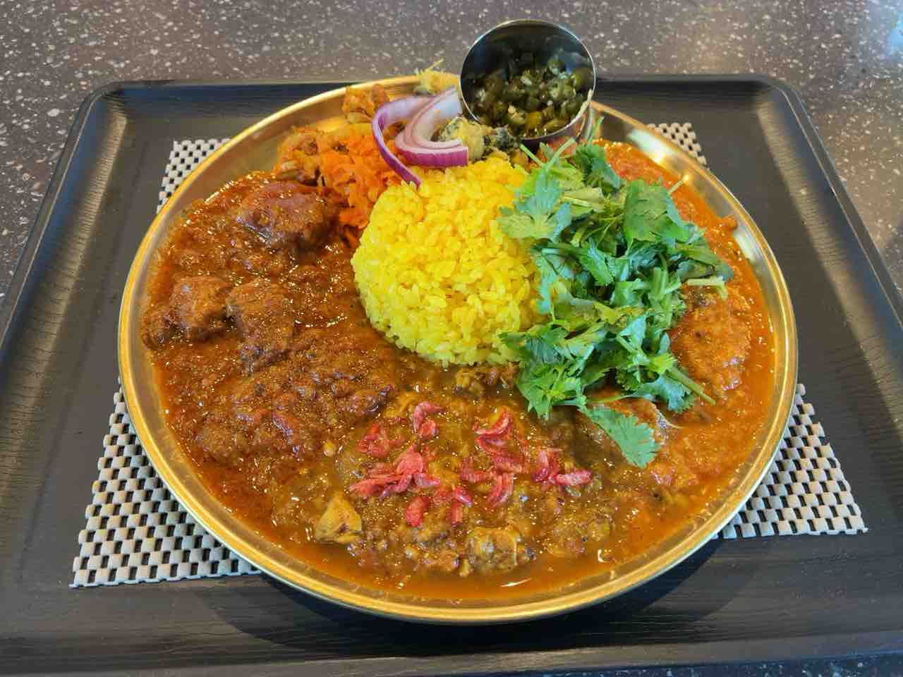 今日のランチは、ちょんまげスパイシーで、3種盛りに青唐辛子スパイスピクルスをトッピング。カレーは、あさりとムング豆の出汁たっぷりカレー、キャッサバ芋と鶏もも肉のココナッツカレー、燻製豚バラ肉のヴィンダルー風(Ver.1)。むむむ、これまた全部美味しい😍キャッサバ芋ってたぶん初めて食べたと思うけど普通のじゃがいもよりあっさりしていて好きかも😋