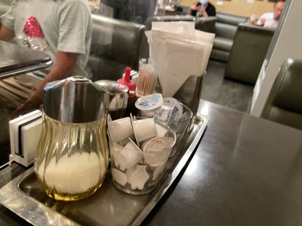 テーブルには調味料のほかに喫茶店らしくガムシロやコーヒーミルが置かれています。