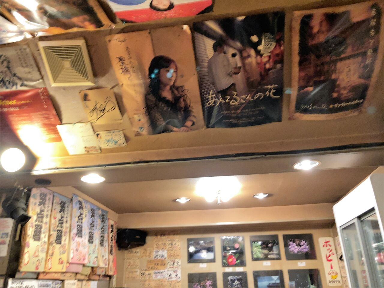 壁や天井、あらゆるところにポスターや写真が貼られています。