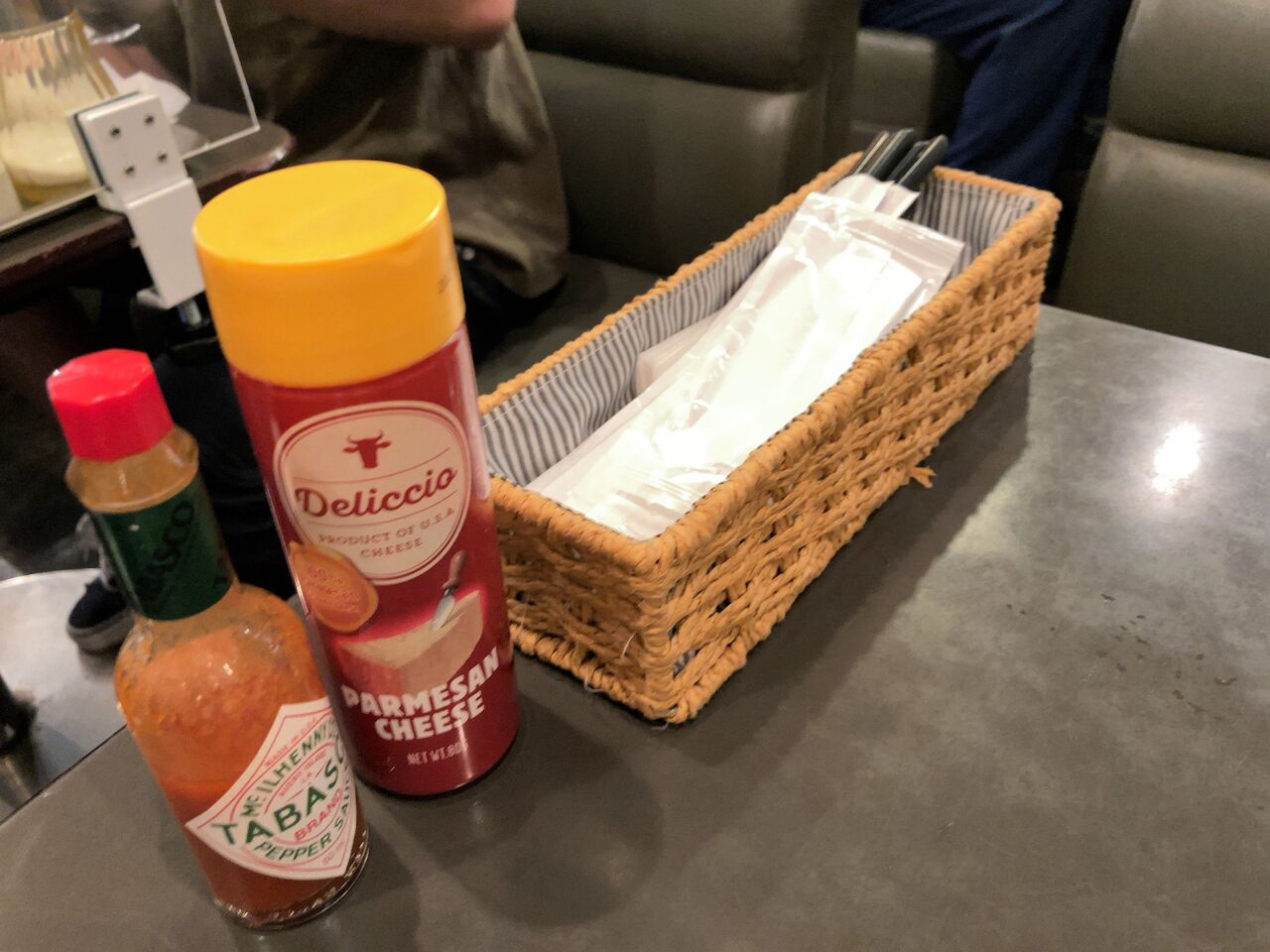 ナポリタンをたのんだからチーズとタバスコが運ばれてきました。
