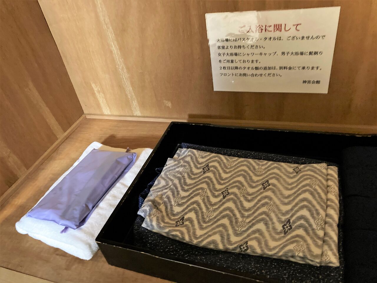 浴衣とタオル、袋に入ったアメニティなどが用意されています。