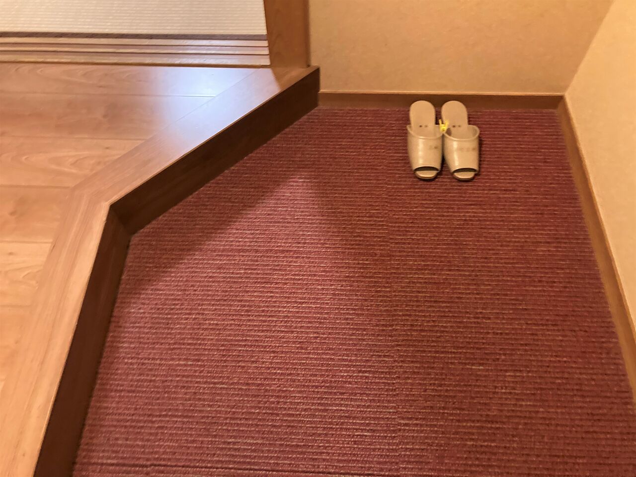 玄関はこんな感じ。廊下と同じく赤い絨毯にスリッパ