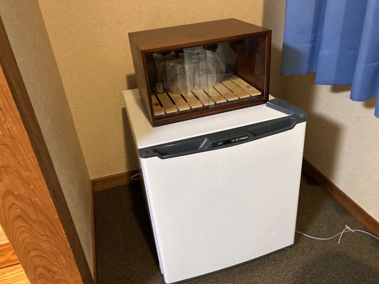 正面には、ミニ冷蔵庫とその上にグラス類の入った棚が置かれています。