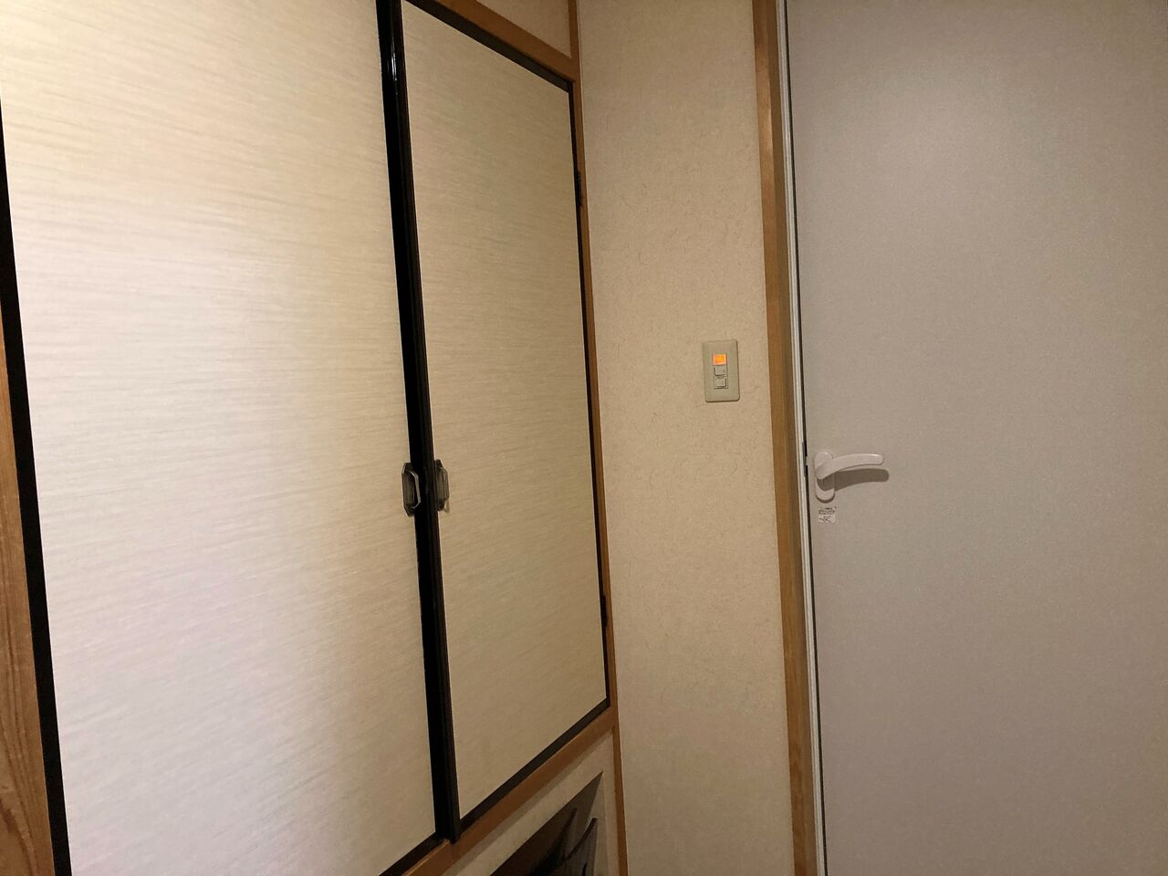 入ってすぐ右側に、収納棚とバス・トイレのドア。