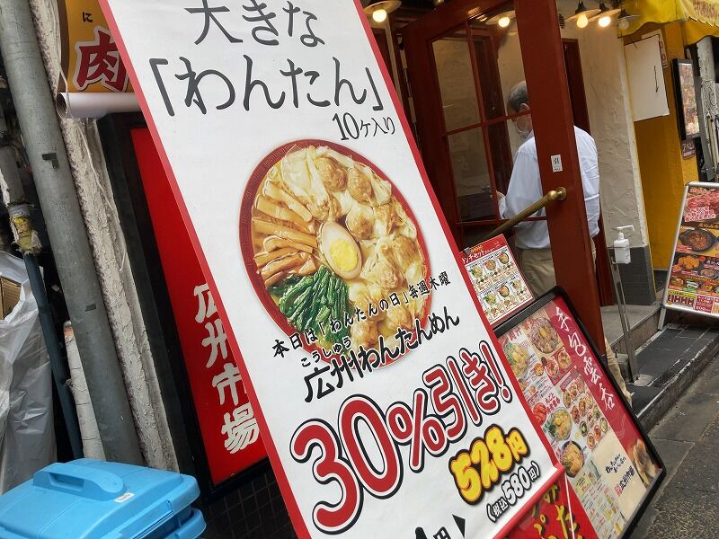 ってよく見たらこんな看板が!そう、この日は「わんたんの日」だったらしく(毎週木曜日だそう)、わんたんが30%引きだったのです。どおりで~