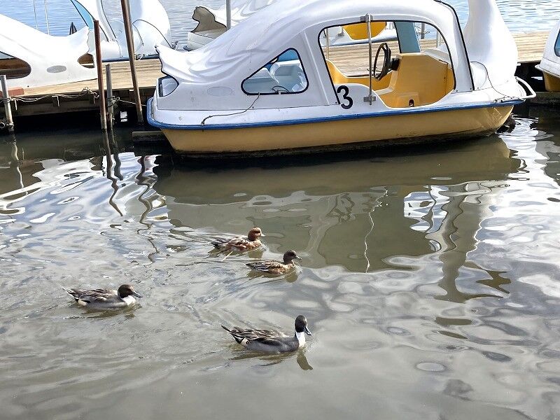 遊覧ボートの近くに鴨さんたちがスイスイ。