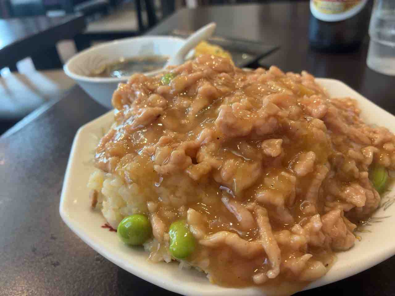 今日のランチは、 龍華で、肉の細切りあんかけ炒飯とニラ玉。ふつうの炒飯が好きだけど気になったのでたのんでみた。あんが美味しい😍ニラ玉も😋しかし凄まじいボリュームだった💦