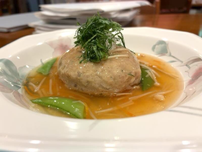 和風出汁のとろみのあるあんかけにスナップエンドウとえのきがキレイに浮かんでいます。